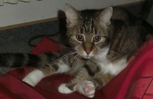 Die grau-braune Tigerdame mit weißen Pfötchen ist 15 Jahre alt, stammt ursprünglich aus Schwalmstadt und war zur Betreuung in Seigerthausen, wo sie entwischt ist.