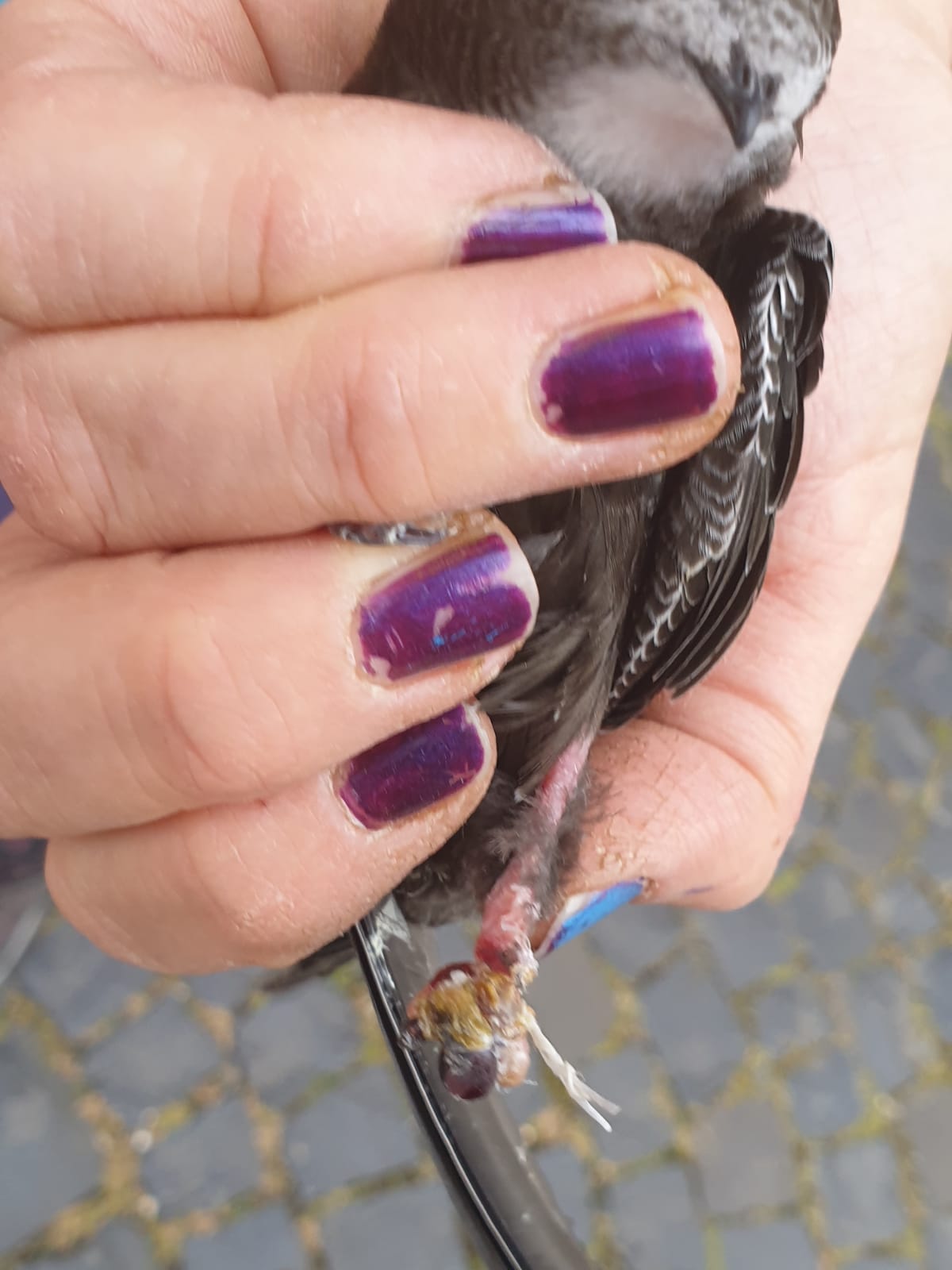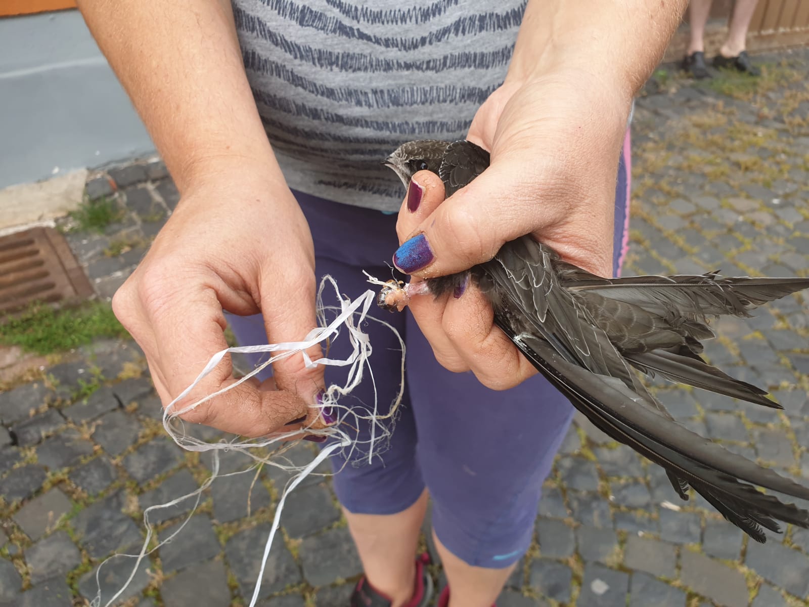 Der Kleine hatte sich mit dem Beinchen in einem Plastikkordel verfangen, was ihn daran hinderte, das Nest zu verlassen.