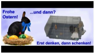 Gerade zu Ostern und im Frühling wünschen sich viele Kinder ein Häschen. Wir möchten Sie bitten, sich vor dem Kauf genau zu informieren. Z.B. auf der Website www.kaninchenwiese.de finden Sie alle relevanten Infos zur Anschaffung, der artgerechten Haltung, Futter, Impfungen usw.