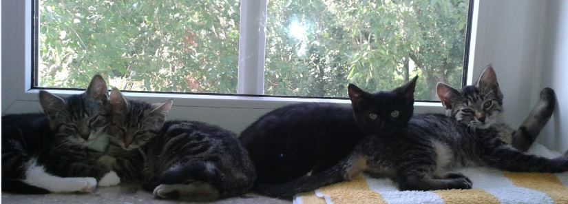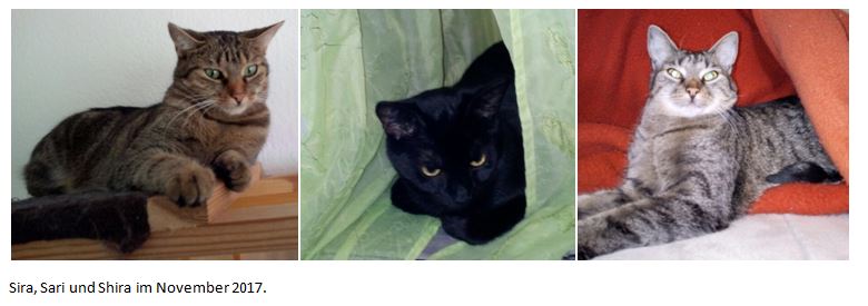 Ende Juli haben wir noch ein viertes Geschwisterchen (Sira) eingefangen, ebenfalls ein kleines Tigerchen. Vor ca. 7 Wochen wurden diese drei Babies von einer wildlebenden Katze geboren und befinden sich seit ein paar Tagen auf einer unserer Pflegestellen. Sie leben sich prima ein und verstehen sich sowohl mit ihren Dosenöffnern als auch dem tierischen Mitbewohner, Kater Findus, sehr gut. In einem Monat etwa sind sie bereit, in eigenes Zuhause mit Freigang überzusiedeln. Am liebsten zu zweit bzw. zu bereits vorhandenen Artgenossen.
