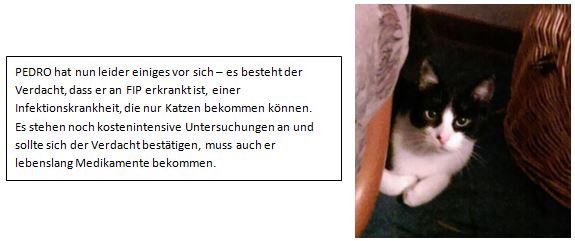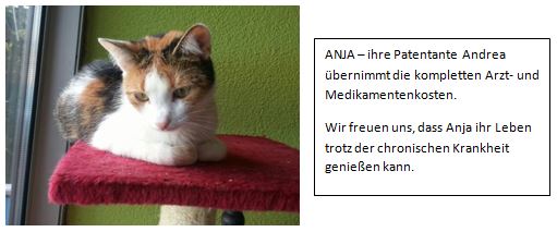 Ihre neue Familie konnte sich leider die weitere Behandlung aus finanziellen Gründen nicht leisten und war gezwungen, Anja an uns zurückzugeben. Seitdem lebt Anja wieder auf ihrer Pflegestelle. Dank der Medikamente geht es der mittlerweile erwachsenen Katzendame sehr gut und sie tobt gemeinsam mit ihren Stiefgeschwistern durch die Wohnung ihrer Pflegeeltern. Die tierärztliche Versorgung wurde seitdem vom Tierschutzverein übernommen. Doch nun sind wir sehr froh, dass wir in diesem Jahr für Anja eine „Patentante“ finden konnten, die dauerhaft ihre monatlichen Medizin- und Tierarztkosten übernimmt.