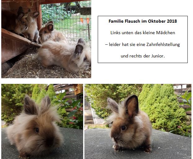 Die inzwischen 2-jährige Frau Flausch und eines ihrer Mädchen suchen immer noch nach einer eigenen Kaninchenfamilie. Sie leben bei uns in freier Gartenhaltung, d.h. sie haben ein sehr großes Freigehege, wo sie mega viel Platz zum rumhüpfen, buddeln und spielen haben, ein gemütliches Häuschen für die Nacht und schlechtes Wetter.