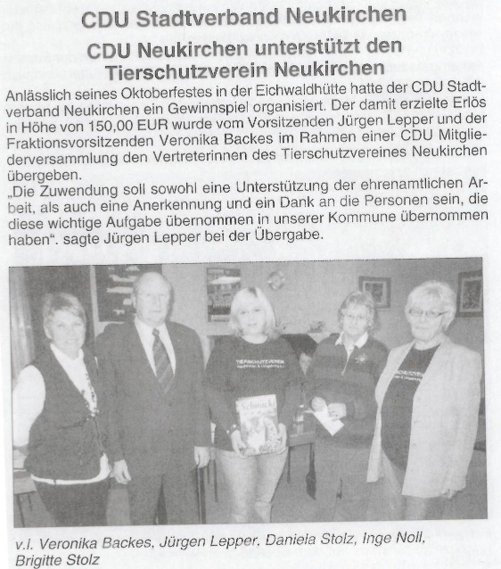 Über einen unverhofften Geldsegen durfte sich der Tierschutzverein Neukirchen freuen. Der CDU Ortsverein Neukirchen feierte Oktoberfest und veranstaltete in diesem Rahmen eine Tombola, dessen Erlöse (150 €) dem Tierschutzverein Neukirchen gespendet wurden. Der Tierschutzverein bedankt sich hierfür ganz herzlich!